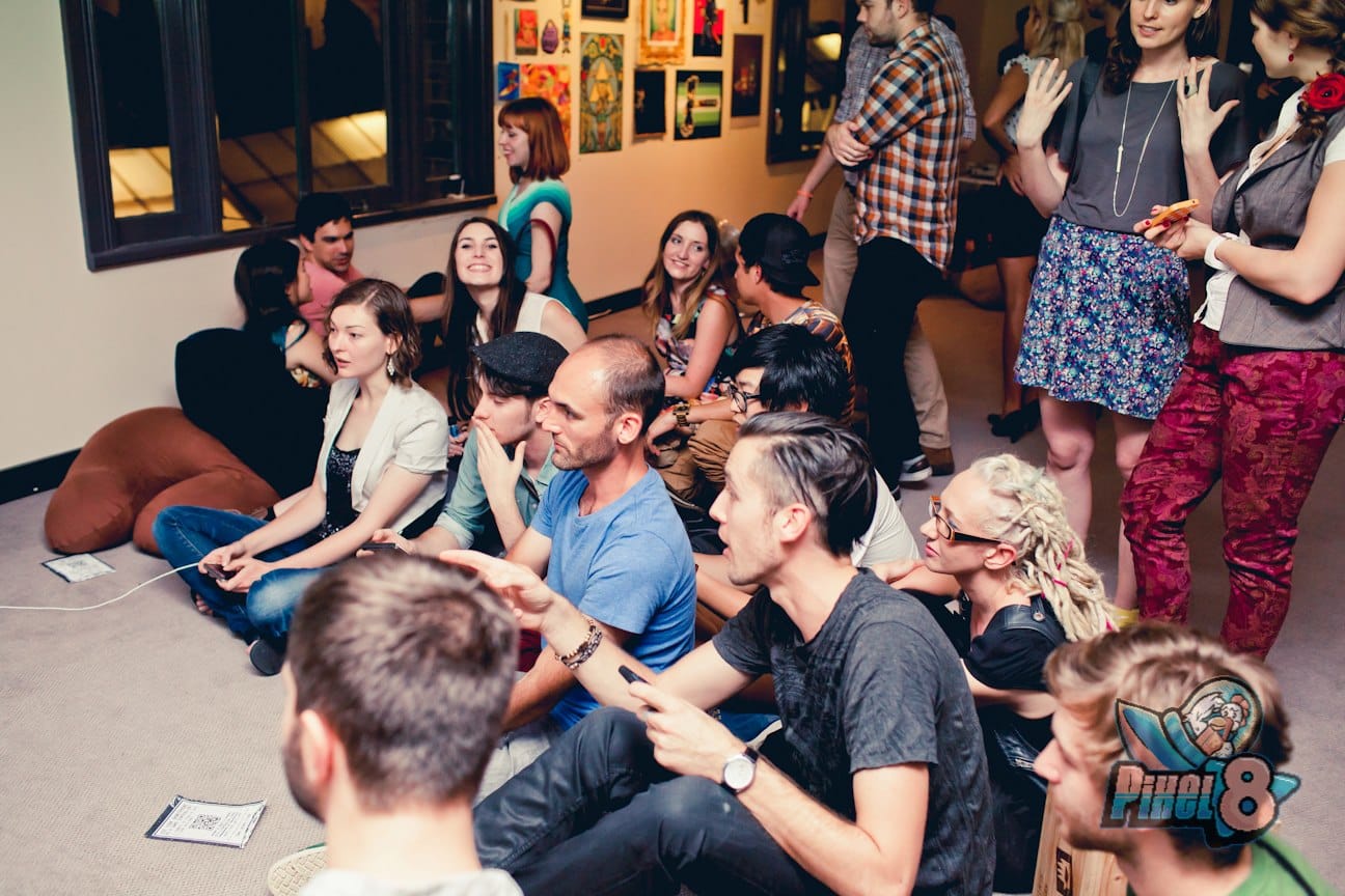 Players use their smartphones to control their characters and their eyes are all affixed to the 8 eMacs and iMacs which show the whole platform-world simultaneously. As such there is no limit to how many people can join (I've seen 20). As space people walk, fly and crash dive between the screens, they disappear for critical seconds as they blindly traverse the negative space between screens. An out of control, single, space person can easily crash into and destroy a very in-control, mission focused space ship. Though non-violent in spirit, these emergent details make the seemingly simple game, incredibly hard and yet addictive.